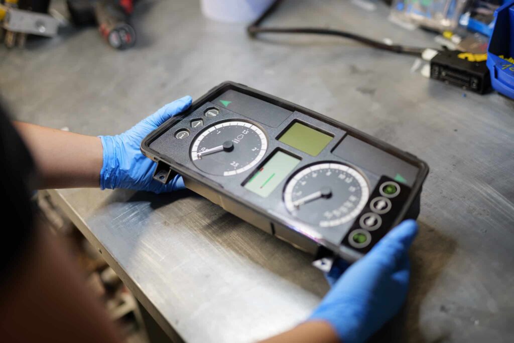 Chez RCC ÉLECTRONIQUE, nous réalisons un démontage complet du tableau de bord, remplaçons les écrans, les circuits imprimés défectueux ou les éléments mécaniques usés (moteurs d’aiguilles, éclairage), et recalibrons l’ensemble du système. Chaque tableau est testé sous contraintes pour garantir un affichage fiable et durable, dans les conditions exigeantes d’utilisation agricole.