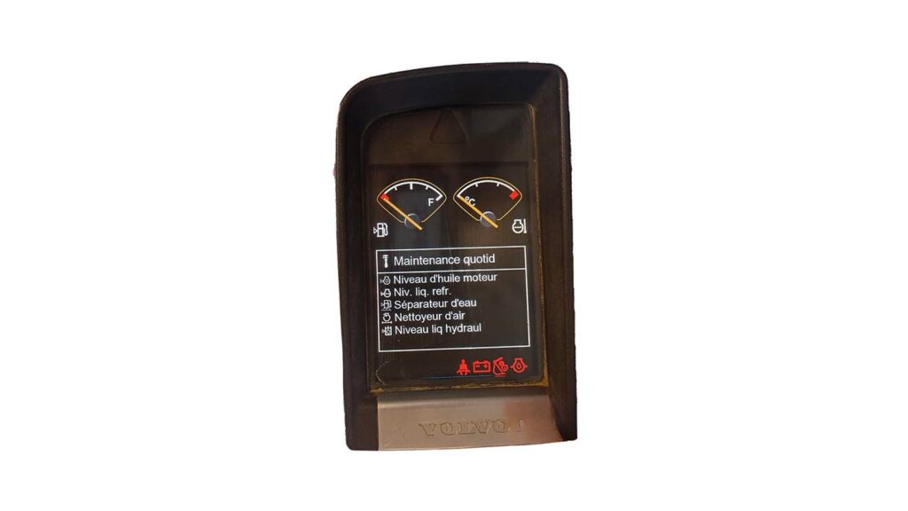 Compteur d’heures, compte-tours, température moteur, pression hydraulique,